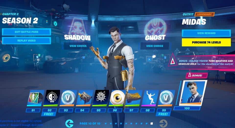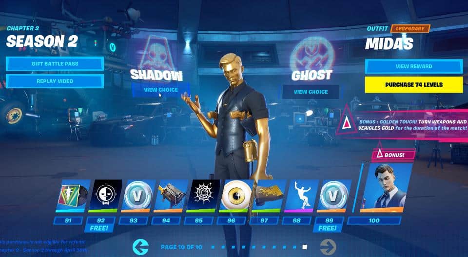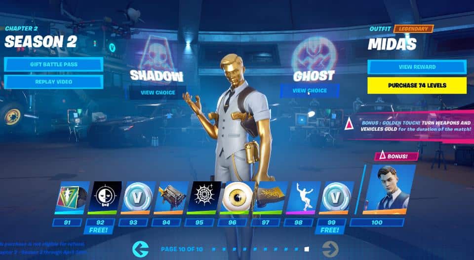 And finally is Midas, the level 100 skin who has a cool ability of turning every item he touches to gold—the colour, not the variant. Even if you drop an item, it will remain gold for anyone else that encounters each. Each battle pass skin also has unique things too from emotes to gliders.