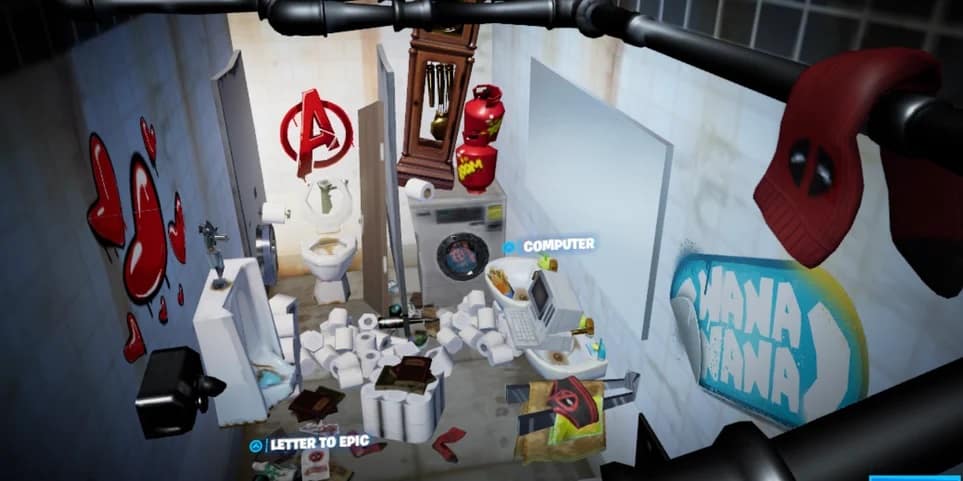 Finally, if you go through the air vent, you come to Deadpool’s secret hideout. Yes, you heard that right, the Marvel character Deadpool is in Fortnite Season 2. As far as we’re aware, he will be the secret skin this season which is awesome, because this is the first time a collaboration skin is in the battle pass. His skin model has been found in the files, so we know he is in the game and its not just a troll.